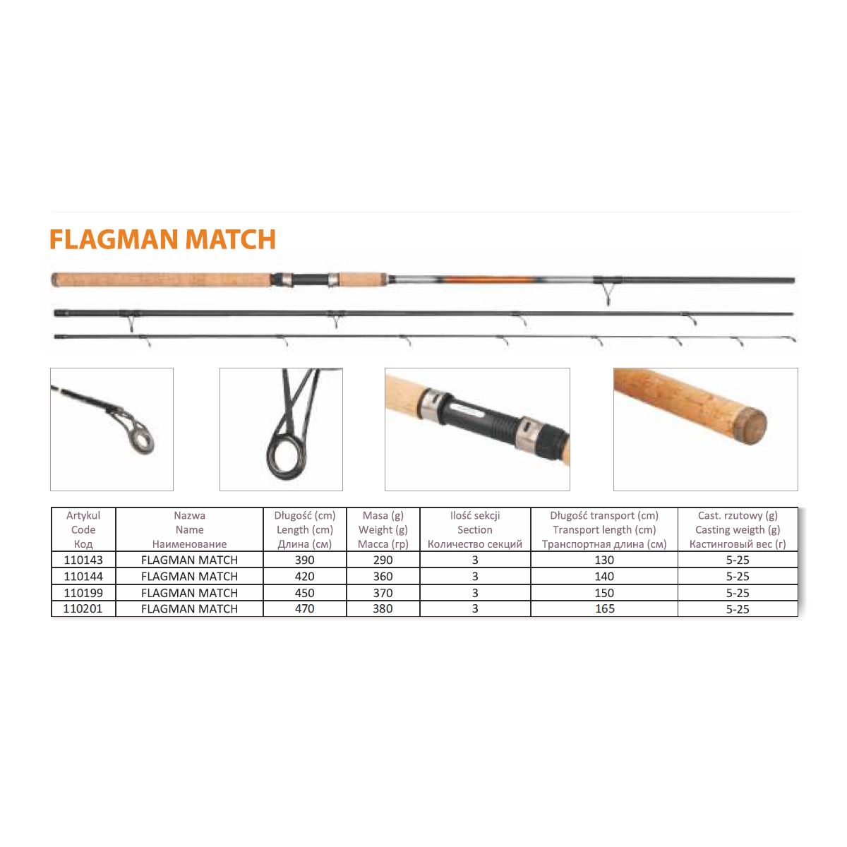 Die Rute besteht aus IM-8 Kohlefaser. Der lange Korkschaft und das Gewicht der gesamten Rute von 349 g sorgen dafür, dass langes Angeln nicht ermüdet. Die Rute zeichnet sich durch progressive Arbeit aus. Die Rute ist mit 14 in UV-beständigem Harz eingebetteten SIC-Ringen ausgestattet. Dank des engen Abstands zwischen den Ringen beim Angeln im Regen vermeiden wir das Phänomen, dass die Schnur am Blank klebt und das Problem eine leichte Posenmontage zu werfen.