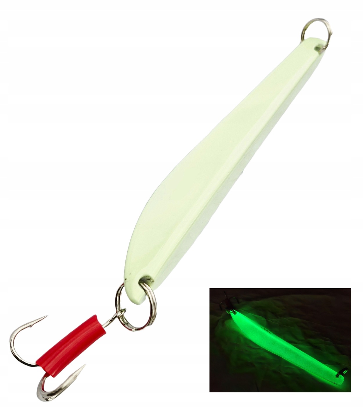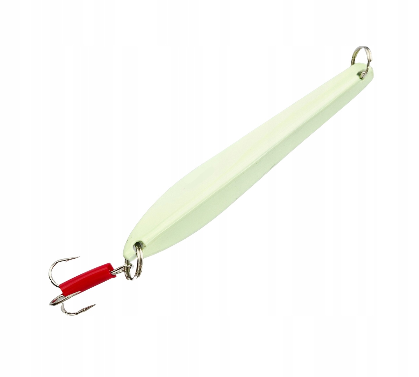 Der Pilker ist mit fluoreszierender Farbe lackiert, die ihn unter Wasser zum Leuchten bringt und so zusätzlich Fische anlockt.